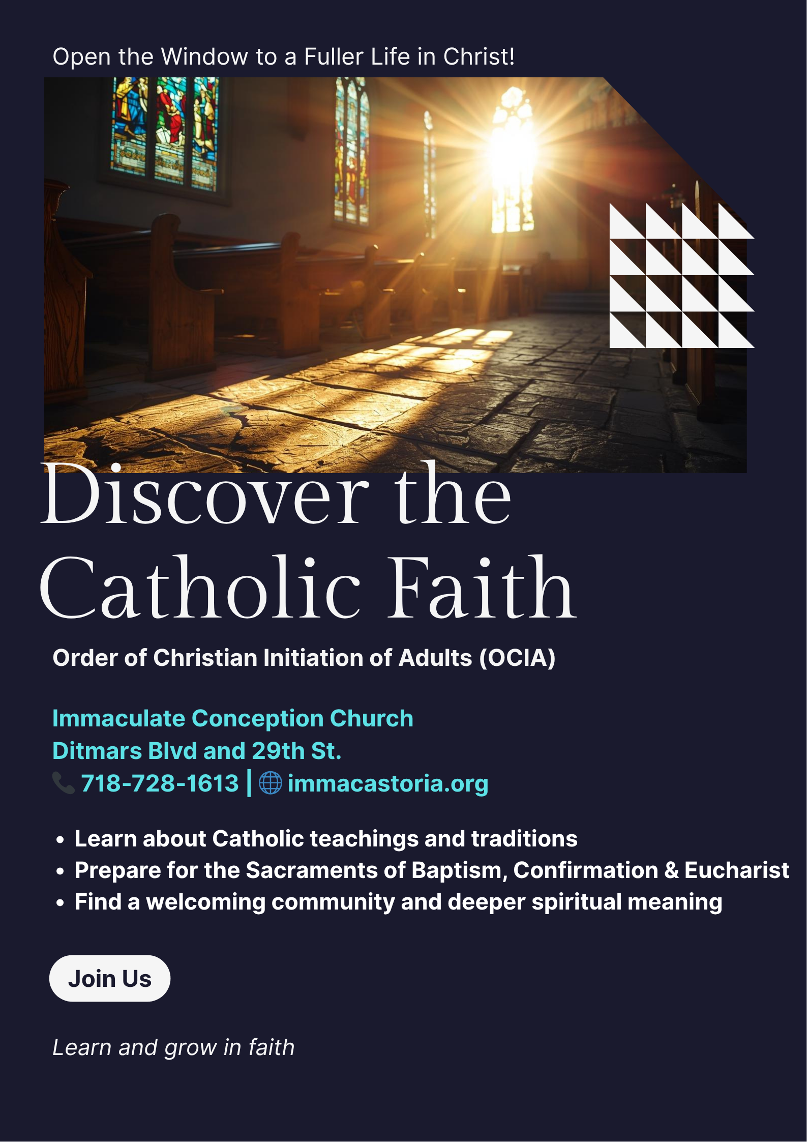 Nestled In the heart of Astoria, Queens, Immaculate Conception Church stands as a vibrant spiritual home with a rich legacy of over 100 years. What sets our parish apart is not just our longevity, but the life that pulses within it- a dynamic blend of cultures, generations and traditions united in one faith. Our Church is a a beautiful reflection of the Astoria neighborhood itself- diverse, welcoming and alive devotion. Here, people from all walks of life gather as one family in Christ, celebrating the sacraments with reverence and joy.
